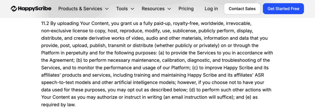 Happy Scribe’s Terms say that by uploading your content: audio, video, transcripts, captions, everything… You automatically grant them a worldwide, irrevocable, royalty-free, perpetual license.